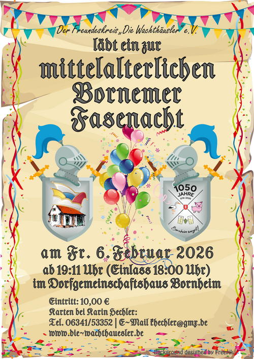 Der Freundeskreis "Die Wachthäusler" e.V. lädt ein zur mittelalterlichen Fasenacht am Freitag, 6. Februar 2026 im Dorfgemeinschaftshaus in Bornheim.Wir feiern ... (... hier weiterlesen)