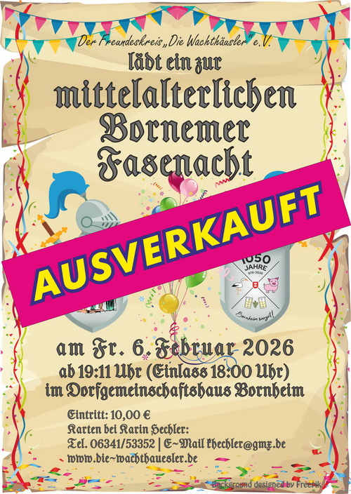 Der Freundeskreis "Die Wachthäusler" e.V. lädt ein zur mittelalterlichen Fasenacht am Freitag, 6. Februar 2026 im Dorfgemeinschaftshaus in Bornheim.Wir feiern ... (... hier weiterlesen)